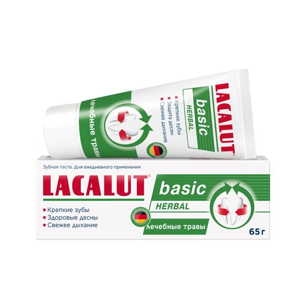 Зубная паста LACALUT basic herbal обеспечивает ежедневную защиту зубов и десен. Эфирные масла листьев эвкалипта, семян бадьяна, травы мяты и листьев шалфея ухаживают за деснами. Лактат алюминия и антисептик укрепляют десны и предотвращают их кровоточивость. Фторид защищает от кариеса и способствует реминерализации зубной эмали. Эфирные масла обеспечивают свежесть дыхания.
