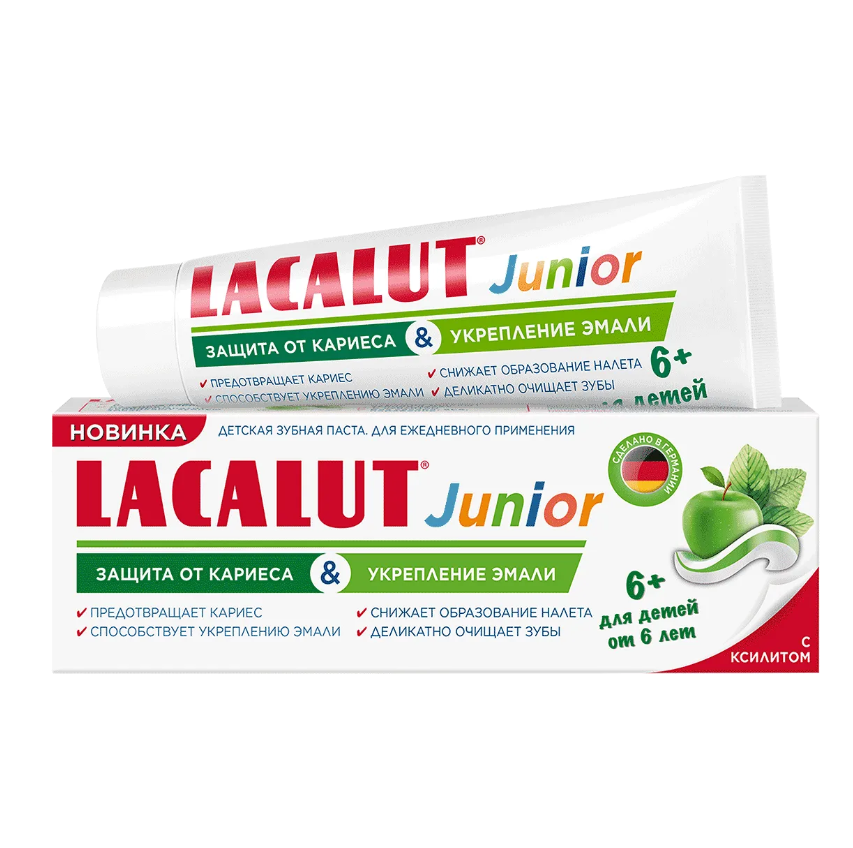 Детская зубная паста Lacalut Junior 6+ создана специально для ухода за зубами детей и подростков старше 6 лет. Свежий вкус яблока и мяты нравится детям. Фторид и ксилит реминерализуют эмаль и препятствуют образованию кариеса постоянных зубов, снижая образование бактериального налета. Кальций и гидроксиапатит укрепляют и полируют зубную эмаль. Мягкие абразивы бережно удаляют зубной налет.
