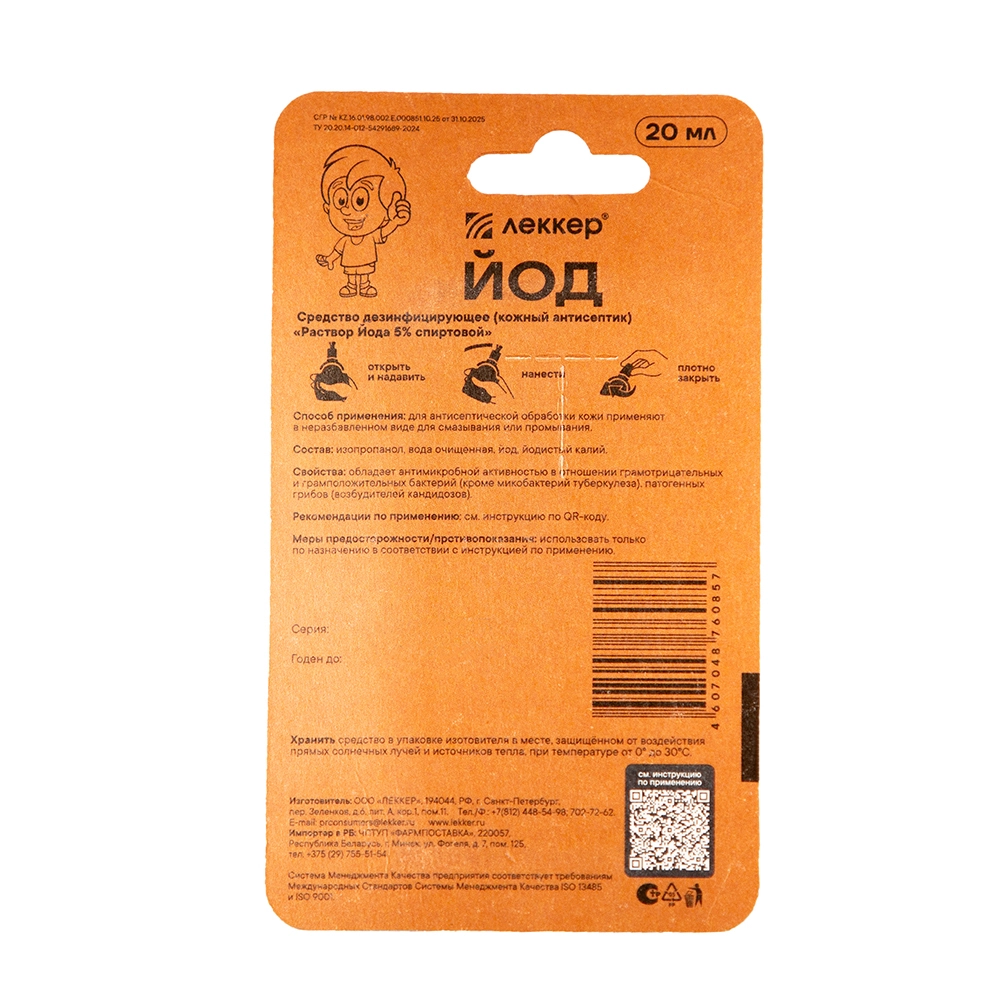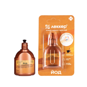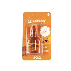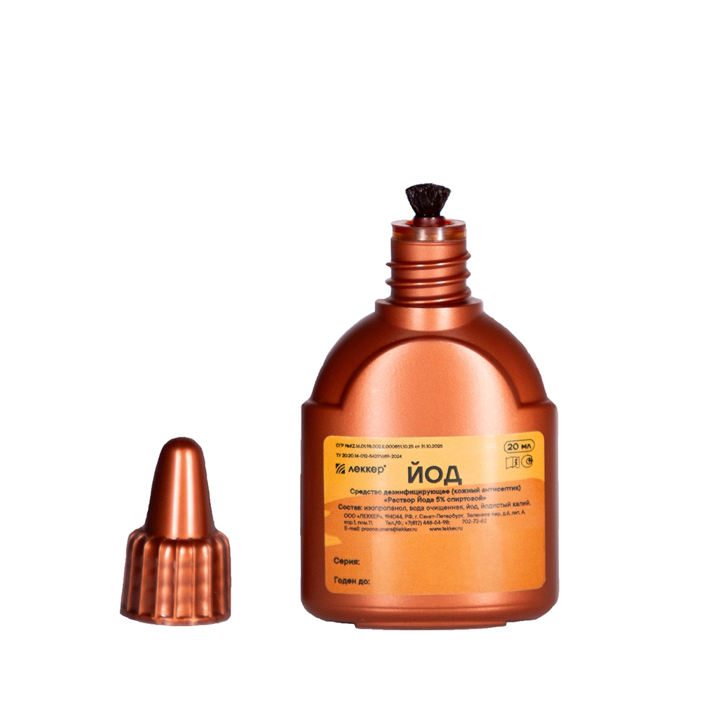 ЛЕККЕР РАСТВОР ЙОДА 5% СПИРТОВОЙ - представляет собой готовый к применению кожный антисептик в виде бесцветной прозрачной жидкости красно-бурого цвета с характерных запахом. ;