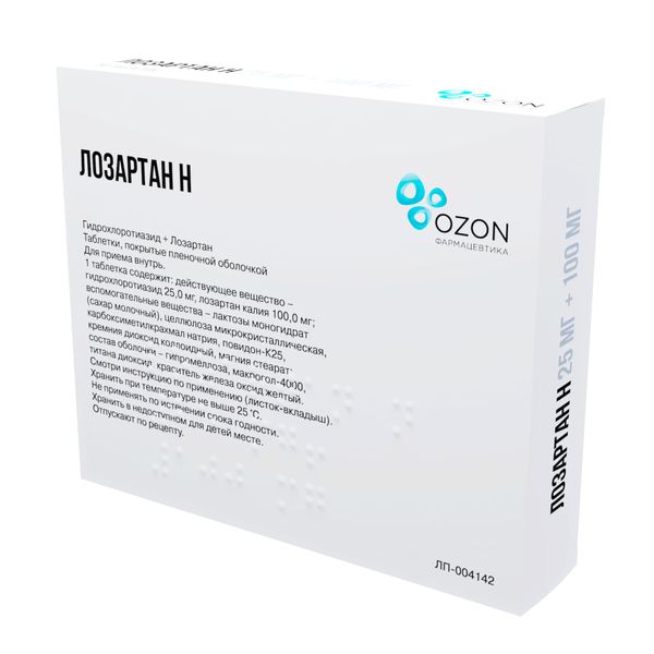 Действующее вещество: гидрохлоротиазид -25,00 мг, лозартан калия — 100,00 мг.