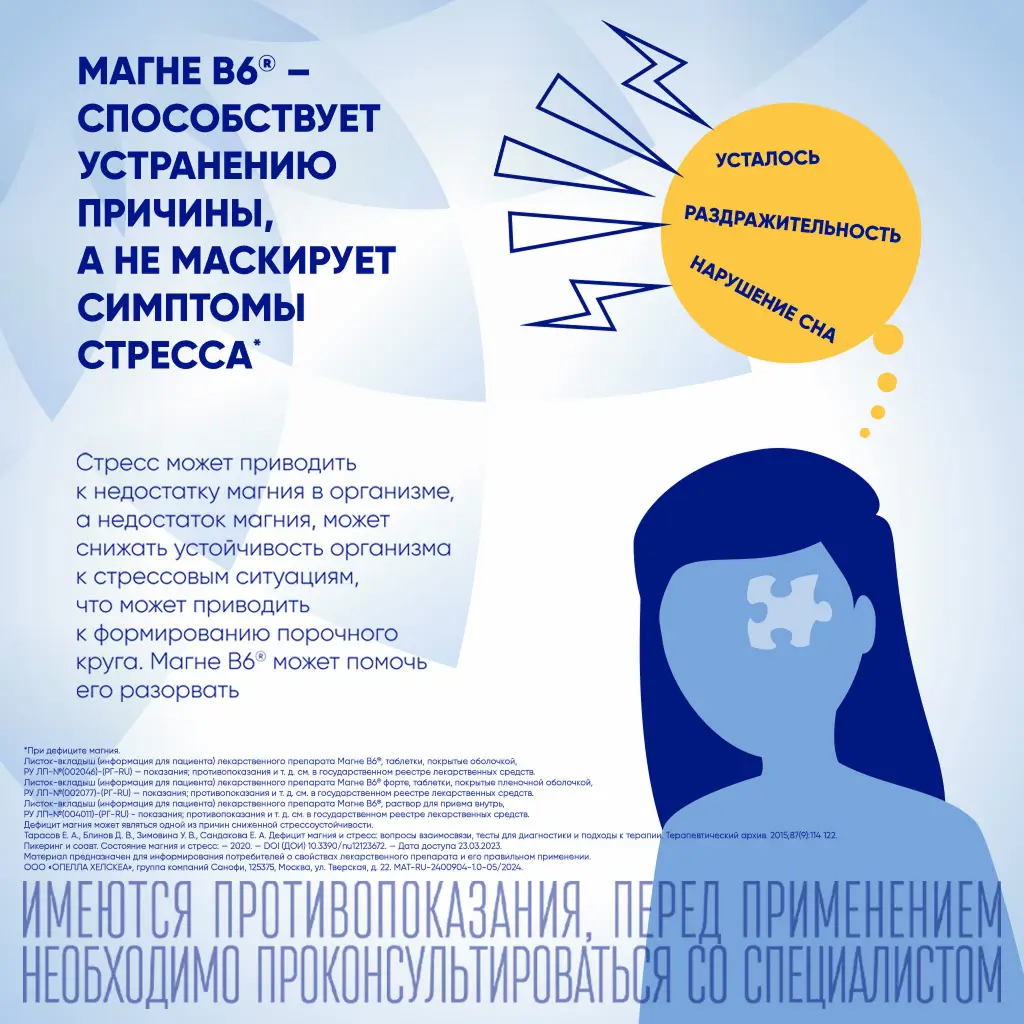 Установленный дефицит магния, изолированный или связанный с другими дефицитными состояниями, сопровождающийся такими симптомами, как повышенная раздражительность, незначительные нарушения сна, желудочно-кишечные спазмы, учащённое сердцебиение, повышенная утомляемость, боли и спазмы мышц, ощущение покалывания в мышцах.