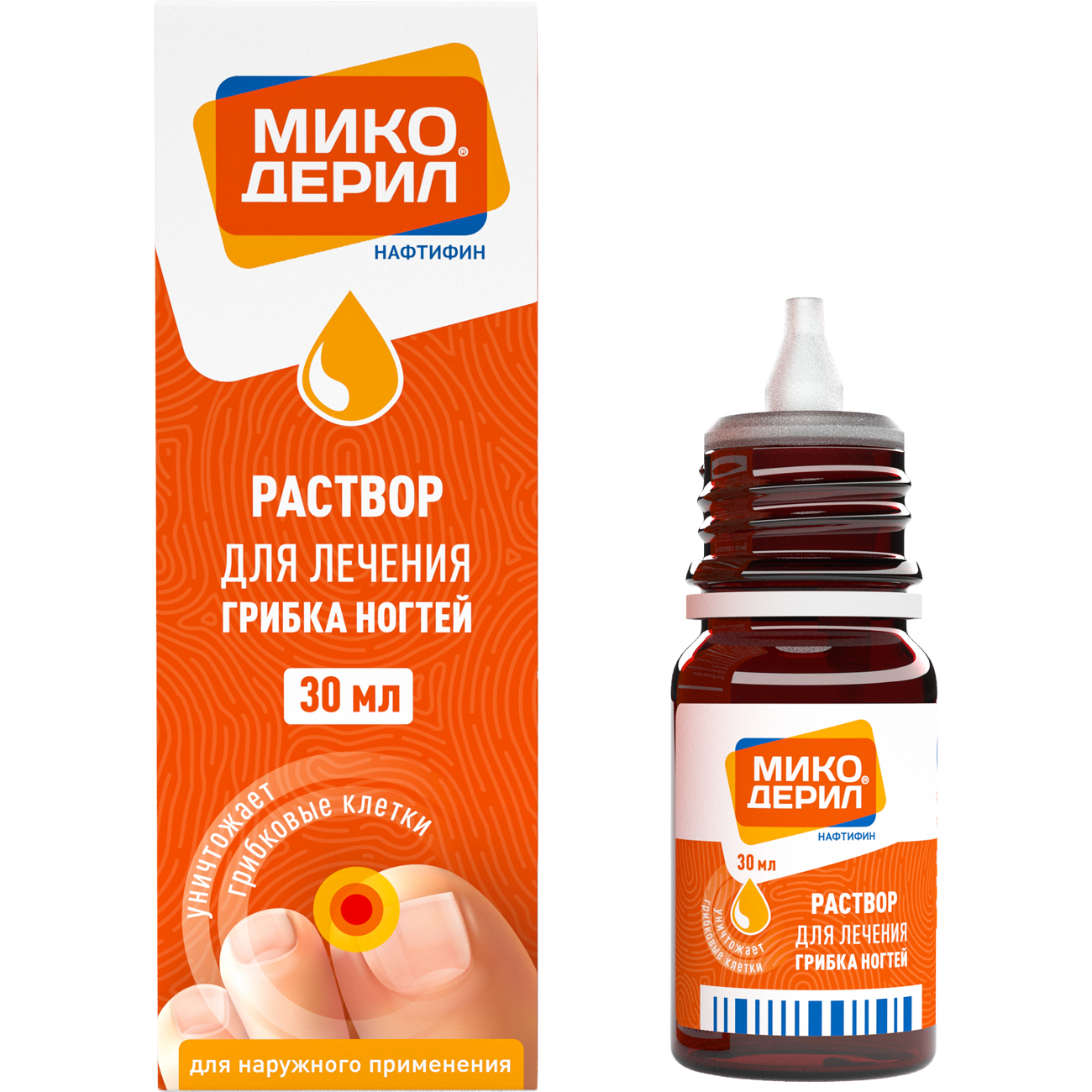 Микодерил®, раствор для наружного применения, 1 % — противогрибковое средство, предназначенное для наружного применения, относящееся к классу аллиламинов. Его активным ингредиентом является нафтифин. Механизм действия связан с ингибированием сквален-2,3-эпоксидазы, что приводит к снижению образования эргостерола, входящего в состав клеточной стенки гриба. Нафтифин, влияя на скваленэпоксидазу, не затрагивает систему цитохрома P-450.