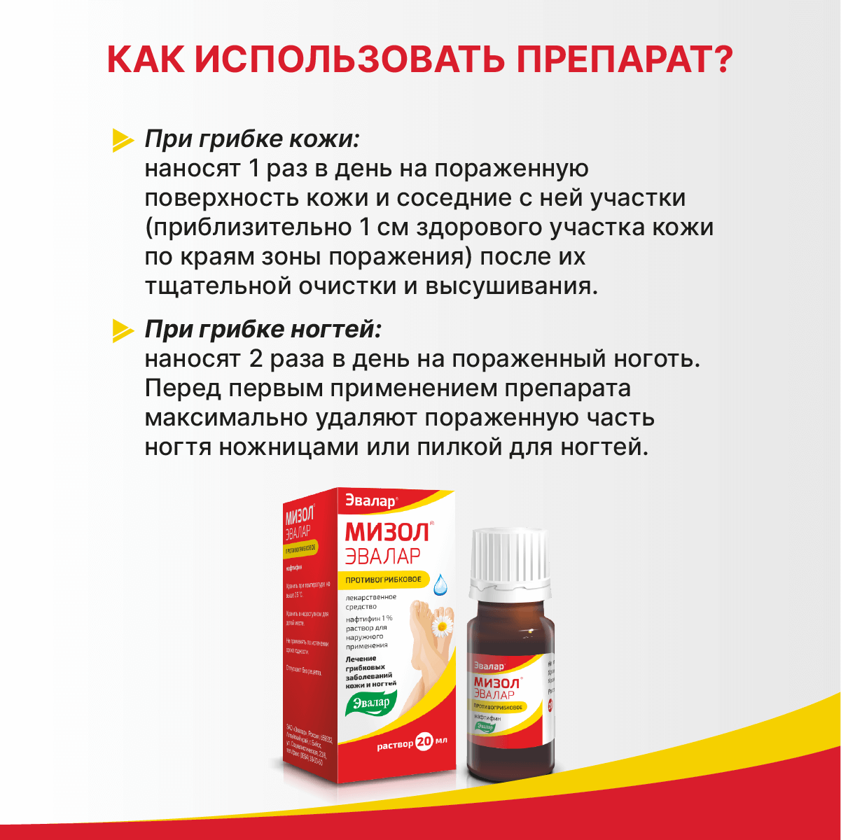При поражении ногтей Мизол® Эвалар наносят 2 раза в день на поражённый ноготь. Перед первым применением препарата максимально удаляют поражённую часть ногтя ножницами или пилкой для ногтей. Длительность терапии при онихомикозах — до 6 месяцев.