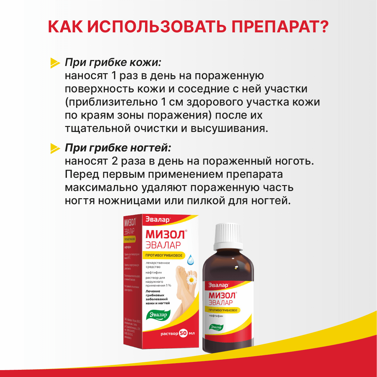 При поражении ногтей Мизол® Эвалар наносят 2 раза в день на поражённый ноготь. Перед первым применением препарата максимально удаляют поражённую часть ногтя ножницами или пилкой для ногтей. Длительность терапии при онихомикозах — до 6 месяцев.