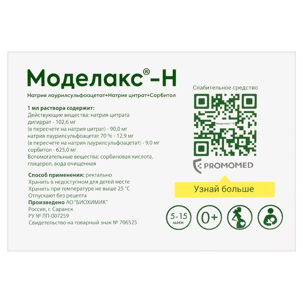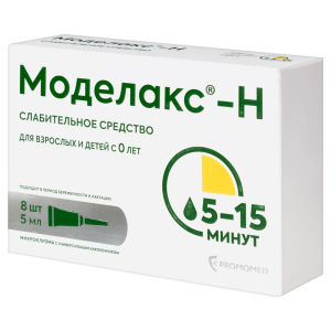 Моделакс®-Н — комбинированный препарат, оказывающий слабительное действие. Эффект наступает через 5–15 минут. В состав препарата входят натрия цитрат (пептизатор, который вытесняет связанную воду, содержащуюся в каловых массах), натрия лаурилсульфоацетат (разжижает содержимое кишечника) и сорбит (усиливает слабительное действие путём стимуляции поступления воды в кишечник). Увеличение количества воды за счёт пептизации и разжижения способствует размягчению каловых масс и облегчает опорожнение кишечника.