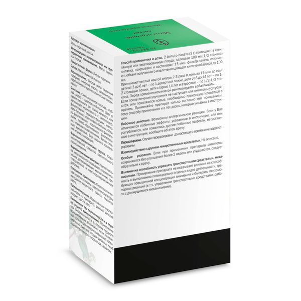 2 фильтр-пакета (3,0 г) помещают в стеклянную или эмалированную посуду, заливают 100 мл (½ стакана) кипятка, накрывают и настаивают 15 минут, периодически надавливая на пакетики ложкой, затем их отжимают. Объём полученного настоя доводят кипячёной водой до 100 мл.