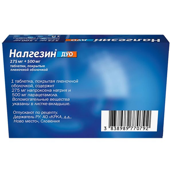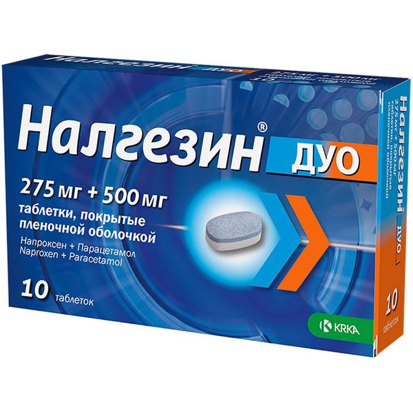 Препарат Налгезин® ;дуо показан для симптоматического лечения боли, требующей более выраженного обезболивающего эффекта, чем ;напроксен ;в дозе 275 мг или ;парацетамол ;в дозе 500 мг по отдельности.