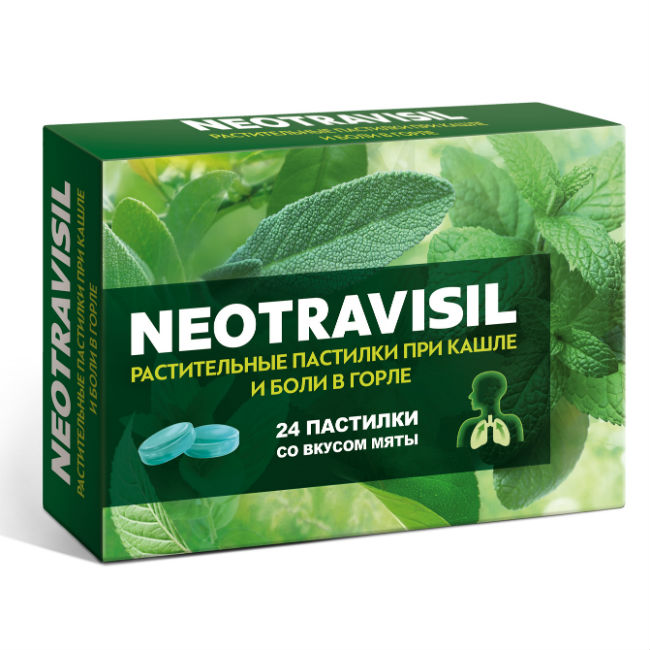 Растительное средство NEOTRAVISIL содержит инновационную комбинацию из 4 экстрактов лекарственных трав: солодки, эвкалипта, камфоры, мяты, а также экстракт плодов апельсина, которые, благодаря комплексному эффекту компонентов, обеспечивают двойное действие: помогают при кашле и боли в горле.