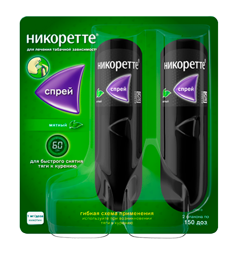 Спрей Никоретте® облегчает и (или) предотвращает тягу к курению и симптомы «отмены», возникающие при табачной зависимости.