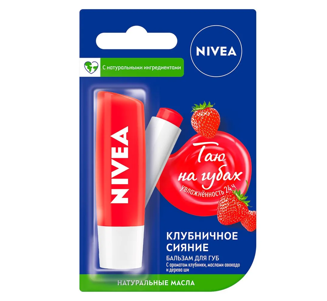 Бальзам для губ NIVEA "Клубничное сияние" маслами авокадо и дерева ши, 4,8 гр. Сочетание экстракта ягод и мерцающих частичек бальзама для губ NIVEA Клубничное сияние придает губам красноватый оттенок и фруктовый аромат. Специальная формула с маслами авокадо и дерева ши делает губы мягкими и нежными, увлажняя их в течение 24 часов. Ценные масла в составе бальзама широко применяются в косметических продуктах. Они быстро абсорбируются кожей, делают ее мягкой и эластичной. Кроме того, они получили высокую оценку экспертов в области ухода за кожей, благодаря высокому содержанию витаминов, питательных веществ, белков, антиоксидантов и полезных жиров. Подходит для использования в любое время года, особенно в весенне-летний период для естественного сияния и легкого увлажнения. Натуральные ингредиенты в составе.