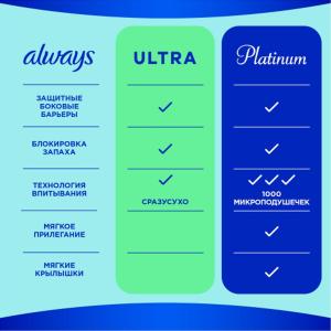 Гигиенические прокладки Always Ultra оснащены технологией нейтрализации запаха, которая блокирует неприятный запах, а не просто маскирует его. Гигиенические прокладки Always Ultra толщиной всего 3 мм дарят комфорт и обеспечивают непревзойденную защиту во время менструации.