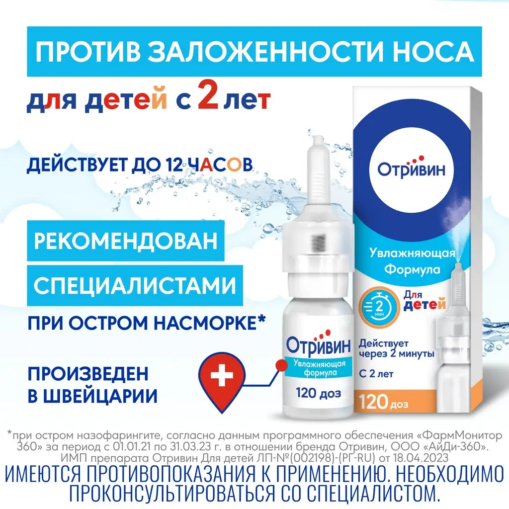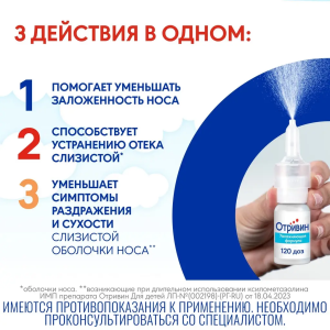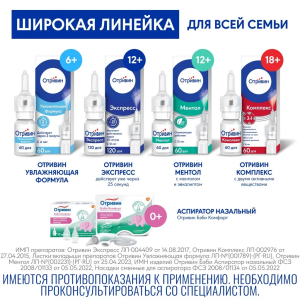 Отривин® хорошо переносится пациентами с чувствительной слизистой оболочкой, его воздействие не препятствует отделению слизи. Отривин® имеет сбалансированное значение pH, характерное для полости носа. В состав препарата входят неактивные компоненты — сорбитол и гипромеллоза (метилгидроксипропилцеллюлоза), которые являются увлажнителями. Таким образом, увлажняющая формула позволяет уменьшить симптомы раздражения и сухости слизистой оболочки носа, возникающие при длительном использовании ксилометазолина.