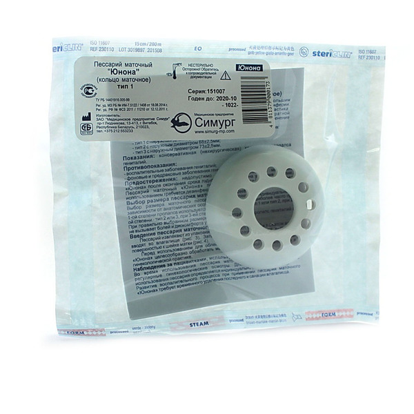 Пессарии маточные «Юнона» из инертного пластика применяются для консервативной коррекции опущения и выпадения матки. По сравнению с подобными изделиями из резины эластичный маточный пессарий «Юнона» гораздо реже вызывает воспаление и более долговечен. Пессарий имеет блюдцеобразную форму с большим центральным отверстием и многочисленными отверстиями по периферии. Гибкий, при нагревании до температуры тела приобретает оптимальную мягкость.
