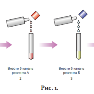 2. Внести в одноразовую пластиковую пробирку 5 капель розового реагента А (рис. 1-2) и 5 капель бесцветного реагента Б (рис. 1-3). Раствор окрасится в бледно-желтый цвет.