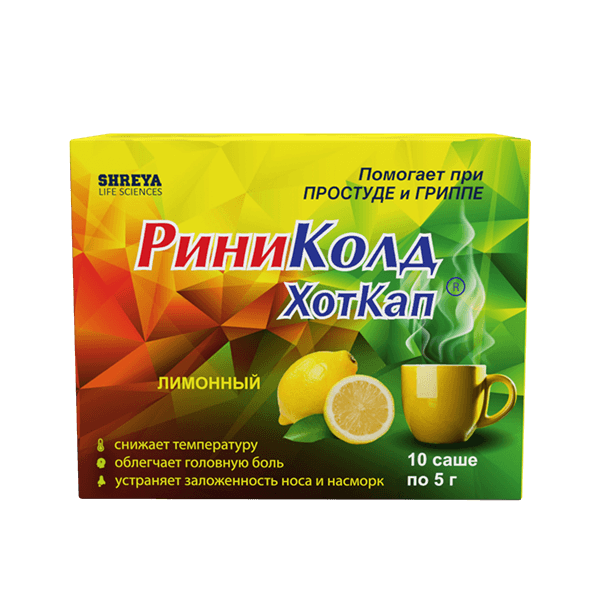 Содержимое 1 саше (пакетика) высыпать в стакан, залить горячей водой, перемешать до полного растворения и выпить (по желанию можно добавить сахар или мед). Принимать препарат РиниКолд ХотКап® необходимо с большим количеством жидкости, через 1-2 часа после приема пищи.