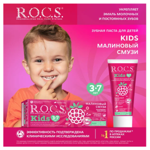 Приятный вкус зубной пасты ROCS Kids «Малиновый Смузи», напоминающий душистую малину, низкоабразивная формула и уникальный состав позволяют обеспечить правильный и приятный уход за полостью рта ребенка, начиная с 3-х лет защитить зубы от кариеса и приучить малыша к ежедневной гигиене ротовой полости без уговоров и нареканий.
