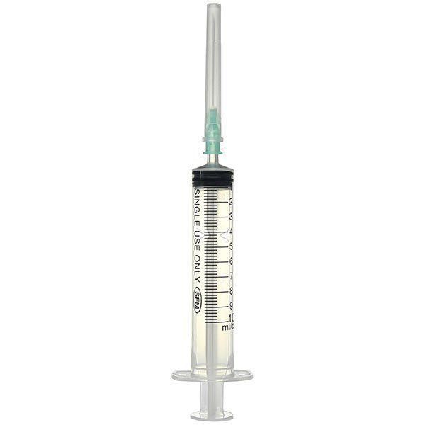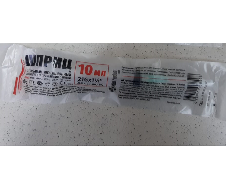 Шприцы трехкомпонентные одноразовые в аптечных упаковках поставляются с иглами. Шприцы применяют для выполнения подкожных, внутримышечных инъекций и других лечебно-диагностических мероприятий. Шприц состоит из трех частей: цилиндр, поршень, манжета на поршне. Трехкомпонентные шприцы объемом 10 мл изготовлены из специального полипропилена и стерильно упакованы. Безболезненность инъекции обуславливается легким скольжением поршня, без трения. Уплотнитель поршня не содержит латекс. Удерживающее кольцо на поршне предотвращает потерю медикамента, а точная градуировка на шприце позволяет легко считывать показания.
