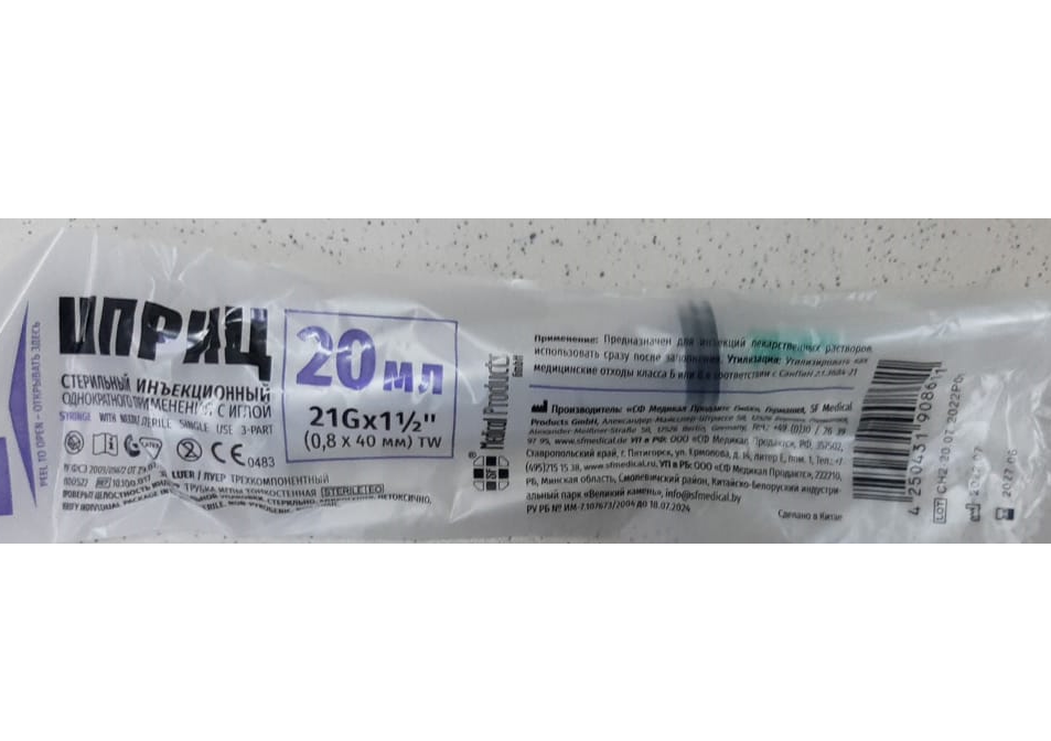 Шприц 20 мл Luer трёхкомпонентный с иглой 0,8 x 40 - 21G SFM