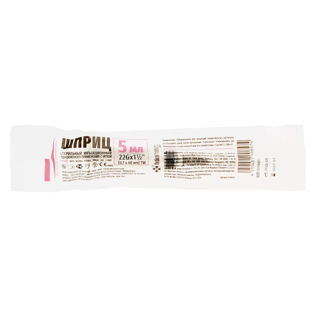 ШПРИЦ SFM 5 мл трехкомпонентный с надетой иглой 0,7 x 40 - 22G.
