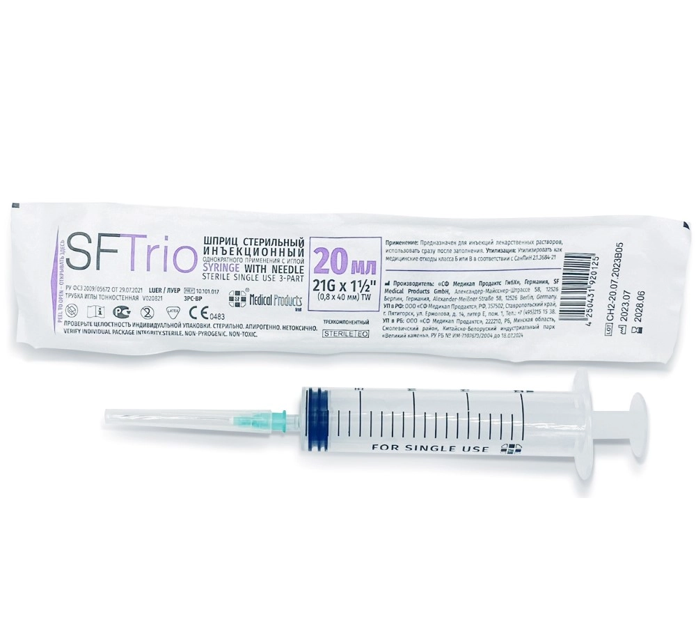 Шприц стерильный инъекционный однократного применения объемом 20мл с иглой 21G x 1 ½ (0.8 x 40 мм) SFTrio №1