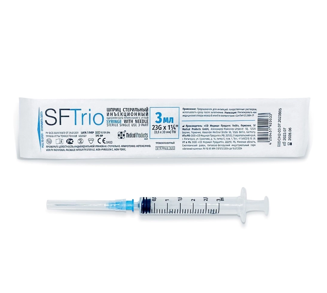 Шприц стерильный инъекционный однократного применения SF Medical Productc GmbH 3 мл с иглой 23G x 1 ¼" (0.6 x 30 мм). Шприц стерильный инъекционный однократного применения состоит из полого прозрачного цилиндра с нанесенной на него градуированной шкалой, наконечником (конусом) с отверстием и упорами для пальцев, штока-поршня с упором штока на нем и уплотнительным кольцом - манжетой (уплотнителем), надетой иглой инъекционной с защитным колпачком на ней. Соединение поршня с цилиндром и конусное соединение наконечника цилиндра с головкой инъекционной иглы водонепроницаемы, воздухонепроницаемы и герметичны под давлением. Шприц стерилизован оксидом этилена.