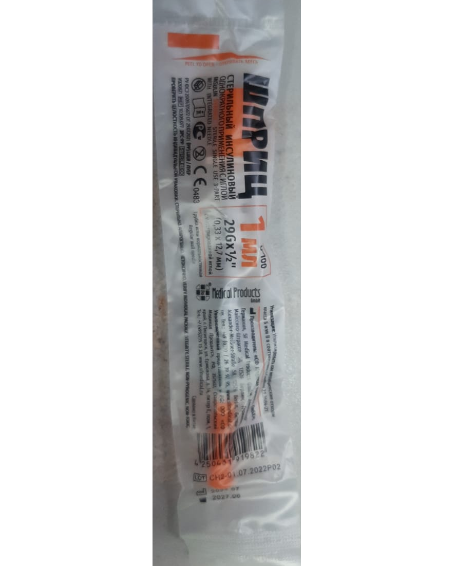 Шприц стерильныей инсулиновый, однократного применения объемом 1 мл с иглой 26G x ½" (0.45 x 12 мм).Производитель "СФ Медикал Продактс ГмбХ", Германия, SF Medical Products GmbH, Alexander-MeiBner-StraBe 58,12526 Berlin, Germany.