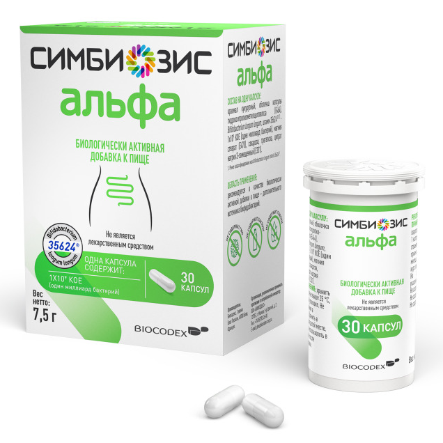 Симбиозис Альфа – целевой пробиотик, содержит таргетный штамм бактерий ;[1] ;Bifidobacterium longum 35624®️ — применяется на протяжении более 10 лет в США, Канаде, Европе и РФ. Кроме того, Симбиозис Альфа производится строго в соответствии c требованиями технического регламента Таможенного союза.