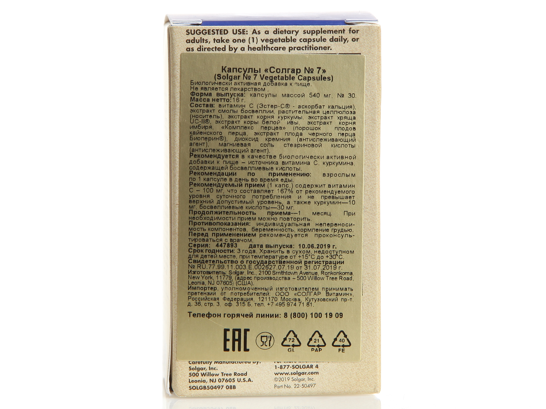Бренд Solgar (Солгар) - всемирно известный производитель высокоэффективных натуральных препаратов для здоровья. Капсулы «Солгар № 7» («Solgar № 7 Vegetable Capsules») - сбалансированный состав.