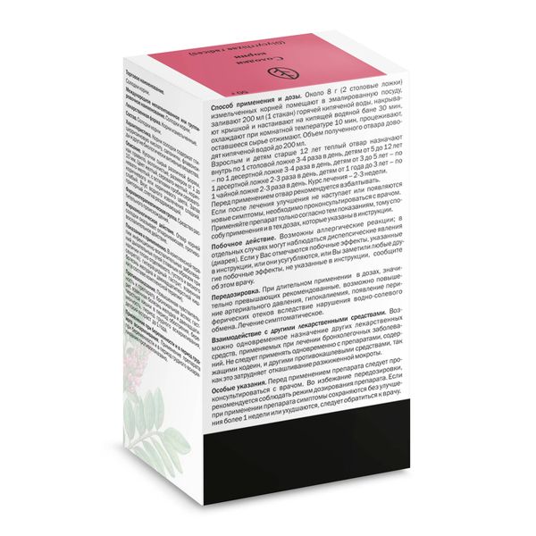 Корни измельчённые по 50 г в пачке картонной с внутренним пакетом. Текст инструкции по применению полностью нанесен на пачку.