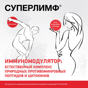 Действующее вещество: ;белково-пептидный комплекс из лейкоцитов крови свиней Суперлимф® 10 ЕД / 25 ЕД.