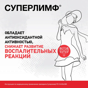 Субстанция Суперлимф ® представляет собой пептидно-белковый комплекс с молекулярной массой менее 40 ;000 Da и активностью ряда цитокинов, включая фактор, угнетающий миграцию макрофагов, получаемый в непрерывном производственном цикле из культур лейкоцитов свиной крови, которые культивируют в бесцветной среде 199. В процессе лиофилизации вспомогательные вещества не используются.