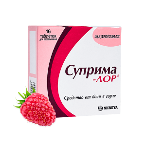 Суприма-ЛОР малиновые: сахароза, декстроза, лимонная кислота, левоментол, краситель азорубин (Е 122), ароматизатор малиновый