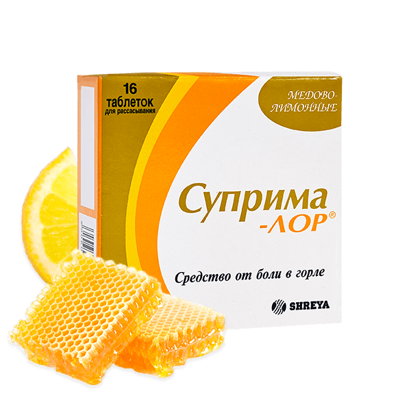 Суприма-ЛОР медово-лимонные: сахароза, декстроза, лимонная кислота, левоментол, краситель хинолиновый жёлтый (Е 104), ароматизатор медовый, лимона масло