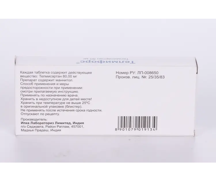 У пациентов со сниженным объёмом циркулирующей крови (гиповолемией) и/или гипонатриемией вследствие интенсивной диуретической терапии, ограничения потребления поваренной соли, диареи или рвоты может развиться симптоматическая артериальная гипотензия, особенно после приёма первой дозы препарата. Перед началом терапии препаратом Телмифорс® необходимо скорректировать нарушения водно-электролитного баланса.