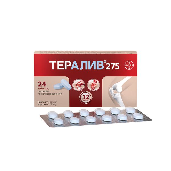 Препарат Тералив 275 представляет собой напроксен, обладает обезболивающим, жаропонижающим и противовоспалительным действием. Механизм действия связан с неселективным ингибированием активности циклооксигеназы-1 и -2 (ЦОГ-1, ЦОГ-2).