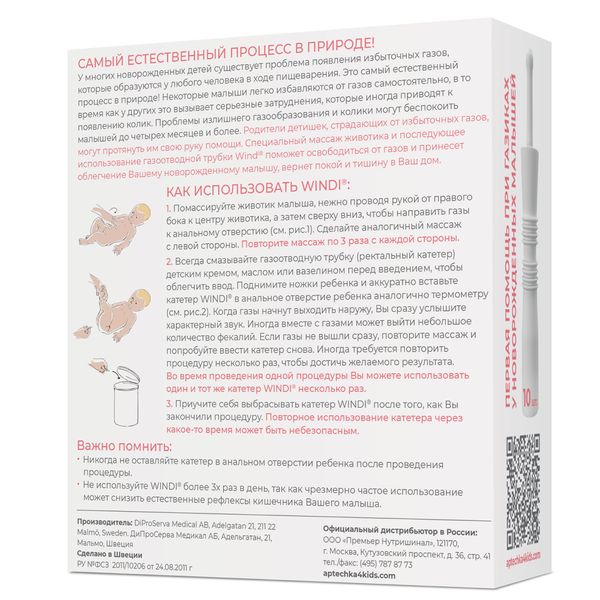 Газоотводную трубочку Windi необходимо применять в сочетании с массажем животика (см. руководство на упаковке), это поможет достичь максимального результата.