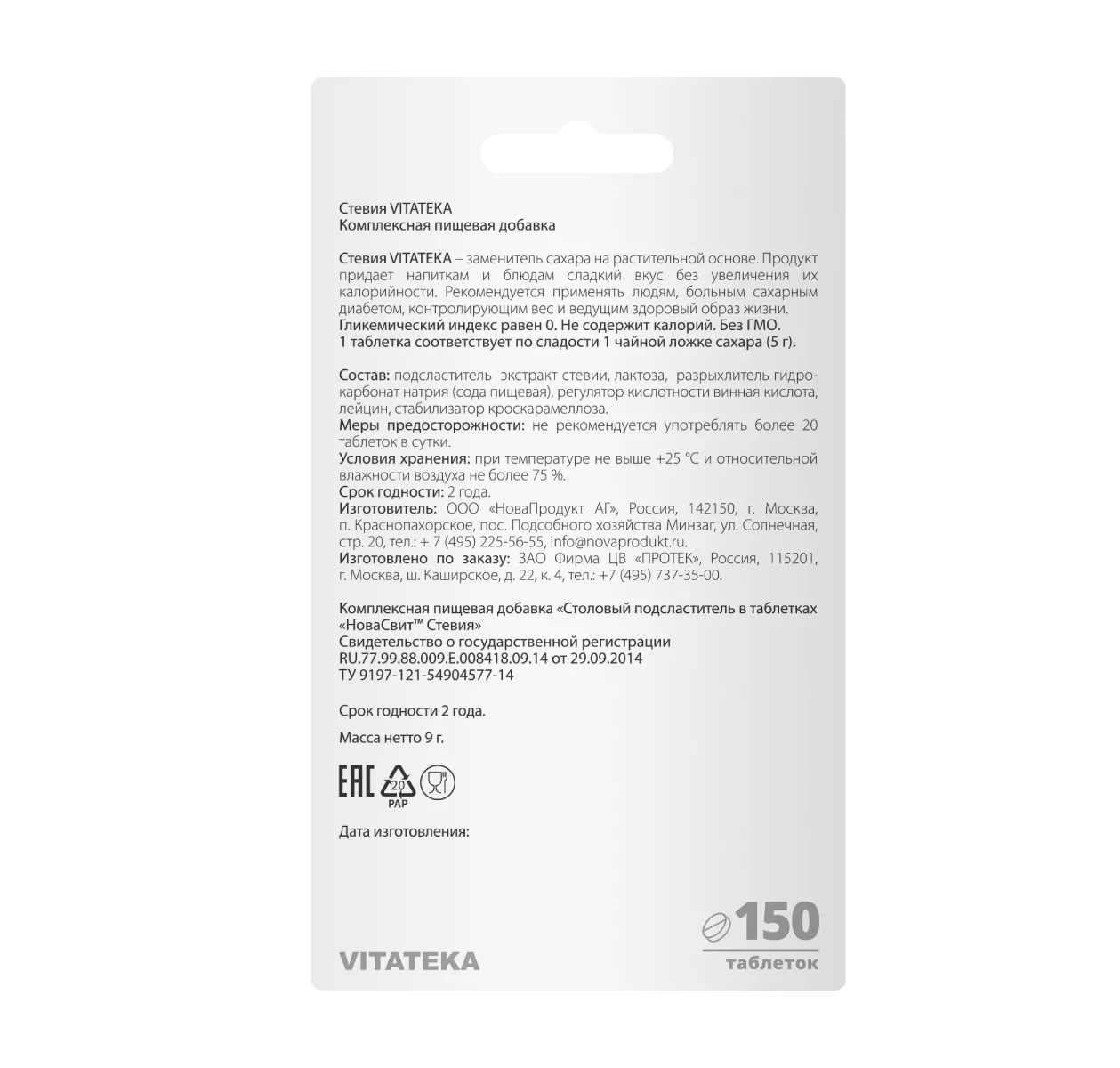 Одна таблетка соответствует по сладости одной чайной ложке сахара (5 г).