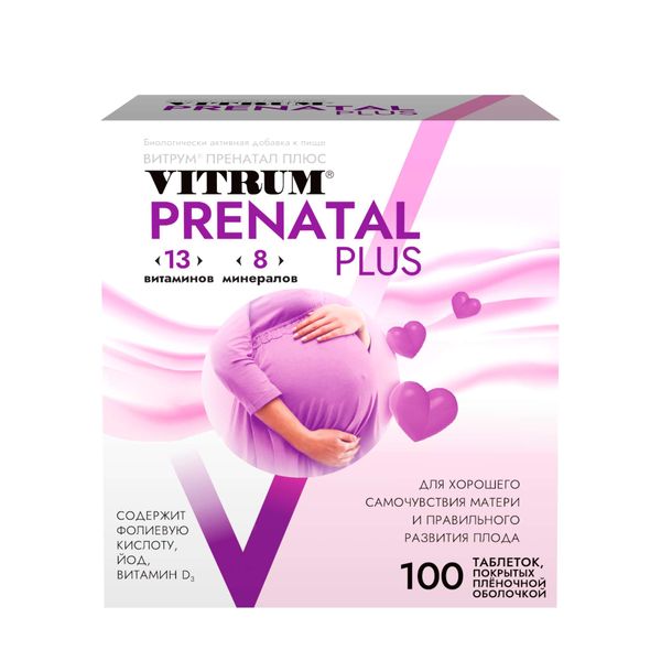 Витрум® Пренатал Плюс (Vitrum® Prenatal Plus) - Биологически активная добавка (БАД) к пище - для хорошего самочувствия матери и правильного развития плода. Восполнение недостатка витаминов и минералов во время беременности, а также снижение риска развития гиповитаминозов и недостатка минеральных веществ в послеродовой период и в период кормления Снижение риска развития железодефицитной анемии у беременных и дефицита йода в организме матери и плода.
