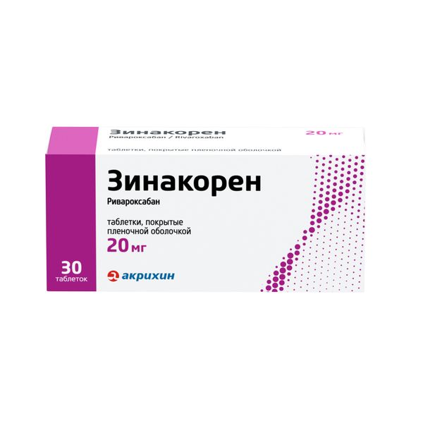 Препарат Зинакорен содержит действующее вещество — ривароксабан, который относится к антитромботическим средствам (антикоагулянтам), т.е. лекарственным препаратам, блокирующим образование тромбов. Его действие основано на подавлении фактора свёртывания крови (прямой ингибитор фактора Ха) и снижении образования тромбина, что приводит к уменьшению формирования тромбов в кровеносных сосудах.